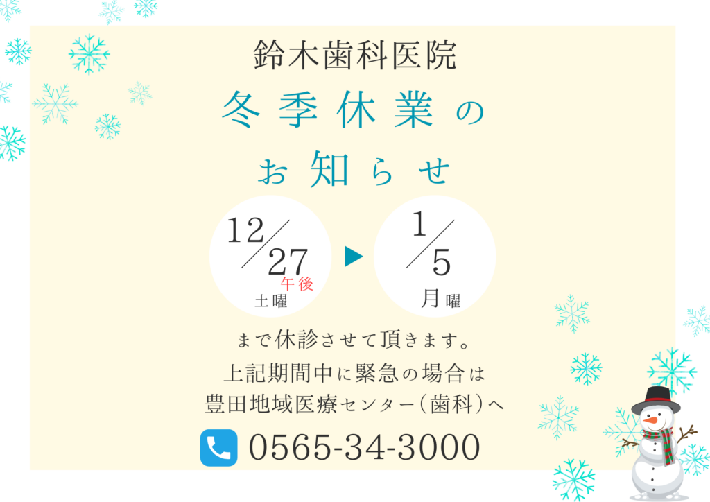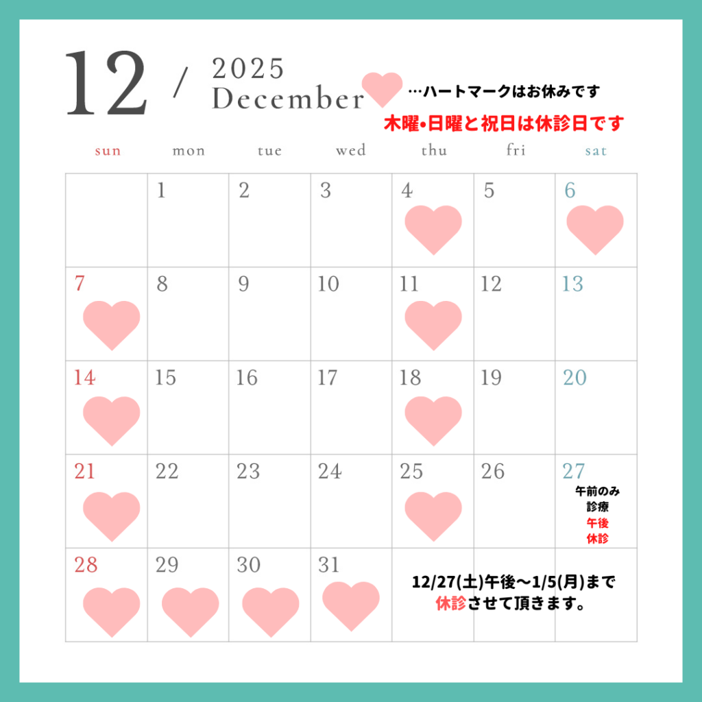 年末年始は12月27日土曜日の午後から1月5日月曜日まで休診とさせて頂きます。