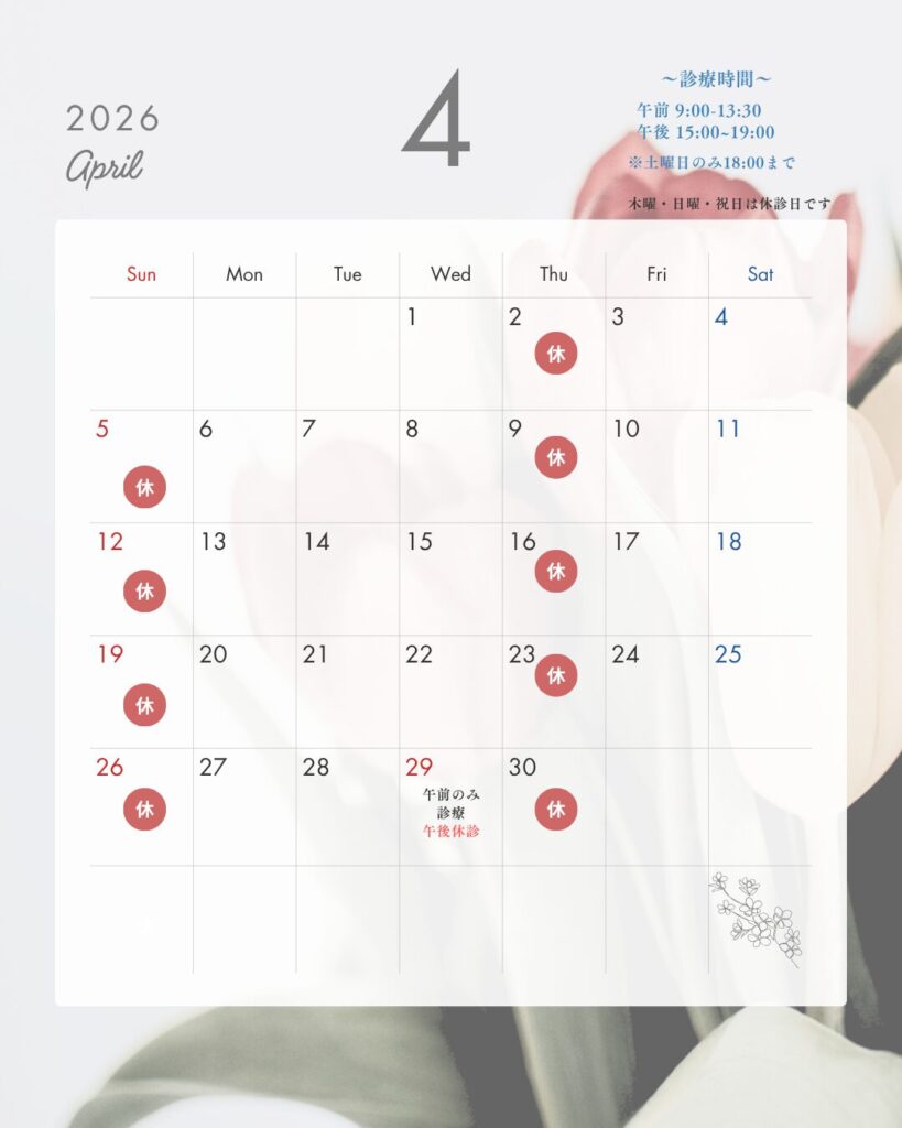 令和8年4月 診療カレンダー 2026年3月23日 Category ブログ 診療カレンダー にこにこレシピ 鈴木歯科新聞 Archives 2026年3月 (2) 2025年12月 (1) 2025年10月 (4) 2025年7月 (4) 2025年3月 (1) 2024年12月 (3) 2024年10月 (2) 2024年9月 (4) 2024年8月 (1) 2024年7月 (3) 2024年6月 (2) 2024年5月 (1)